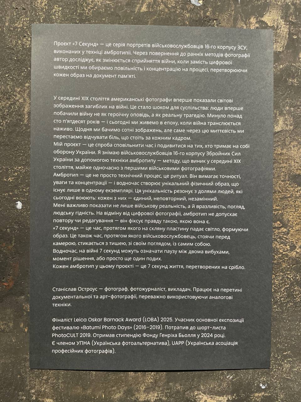 Напередодні, 29 листопада відбулося відкриття виставки фотографічних робіт Станіслава Остроуса під назвою «7 секунд. Амбротипи», на якій представлені портрети військовослужбовців 16-го корпусу ЗСУ, зняті у техніці амбротипії. Його роботи поєднують документальний підхід і арт-фотографію, створюючи щирі та емоційно насичені образи.