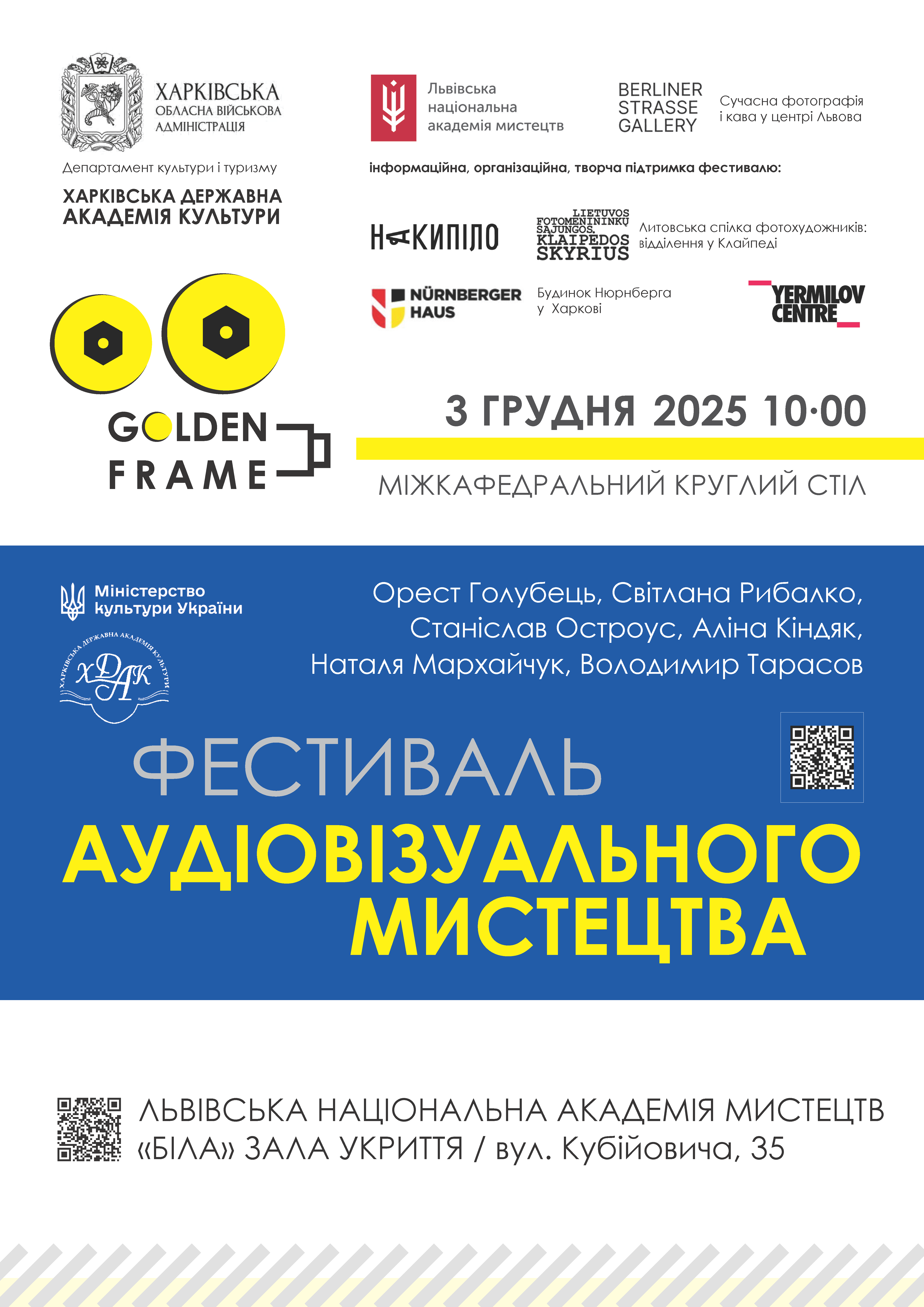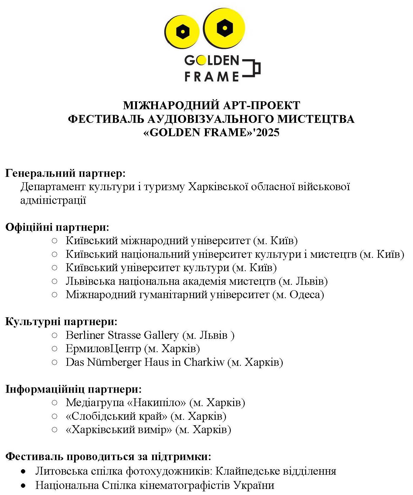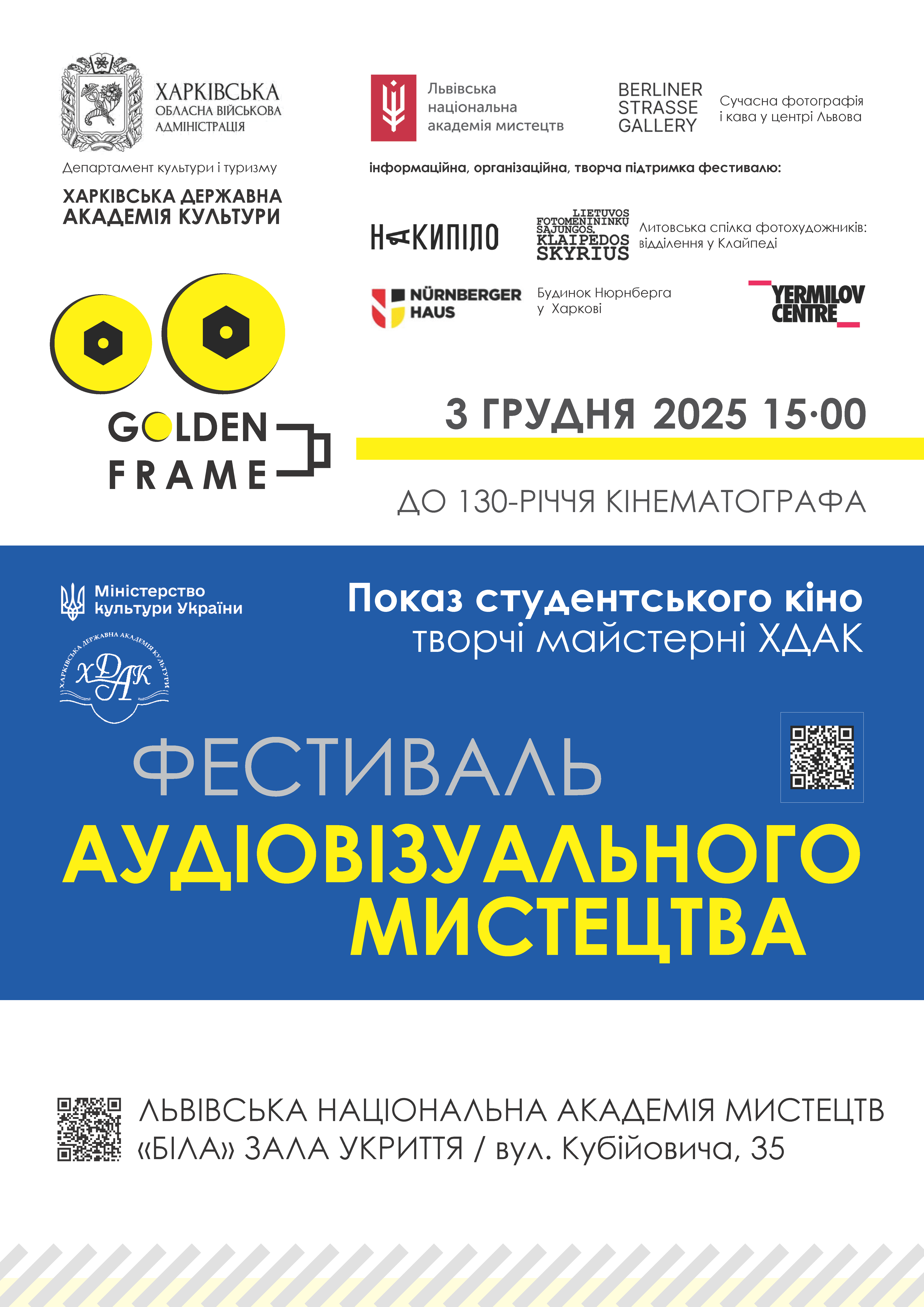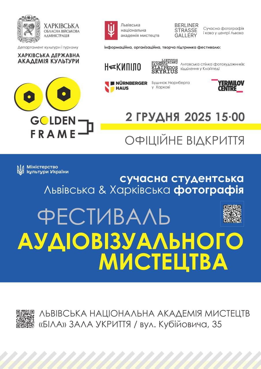 3 грудня 2025 року у Львівській національній академії мистецтв, яка є офіційним партнером Міжнародного артпроєкту «Фестиваль аудіовізуального мистецтва «GOLDEN FRAME’2025», відбувся показ студентських фільмів творчих майстерень факультету аудіовізуального мистецтва Харківської державної академії культури.