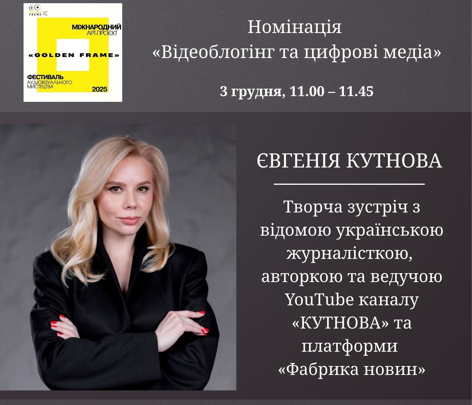 У межах номінації «Відеоблогінг та цифрові медіа» Міжнародного фестивалю аудіовізуального мистецтва «Golden Frame 2025» відбулась творча зустріч з відомою українською журналісткою, авторкою і ведучою YouTube-каналу «КУТНОВА» та платформи «Фабрика новин» Євгенією Кутновою.