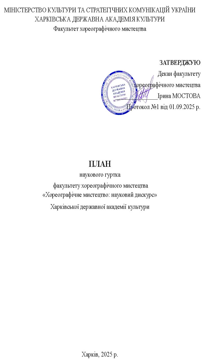 План наукового гуртка факультету хореографічного мистецтва «Хореографічне мистецтво: науковий дискурс» Харківської державної академії культури