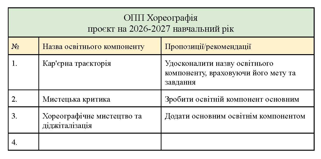 Проєкт освітньо-професійної програми "Хореографія" другого (магістерського) рівня вищої освіти за спеціальністю В6 Перформативні мистецтва спеціалізацією В6.03 Хореографічне мистецтво  |