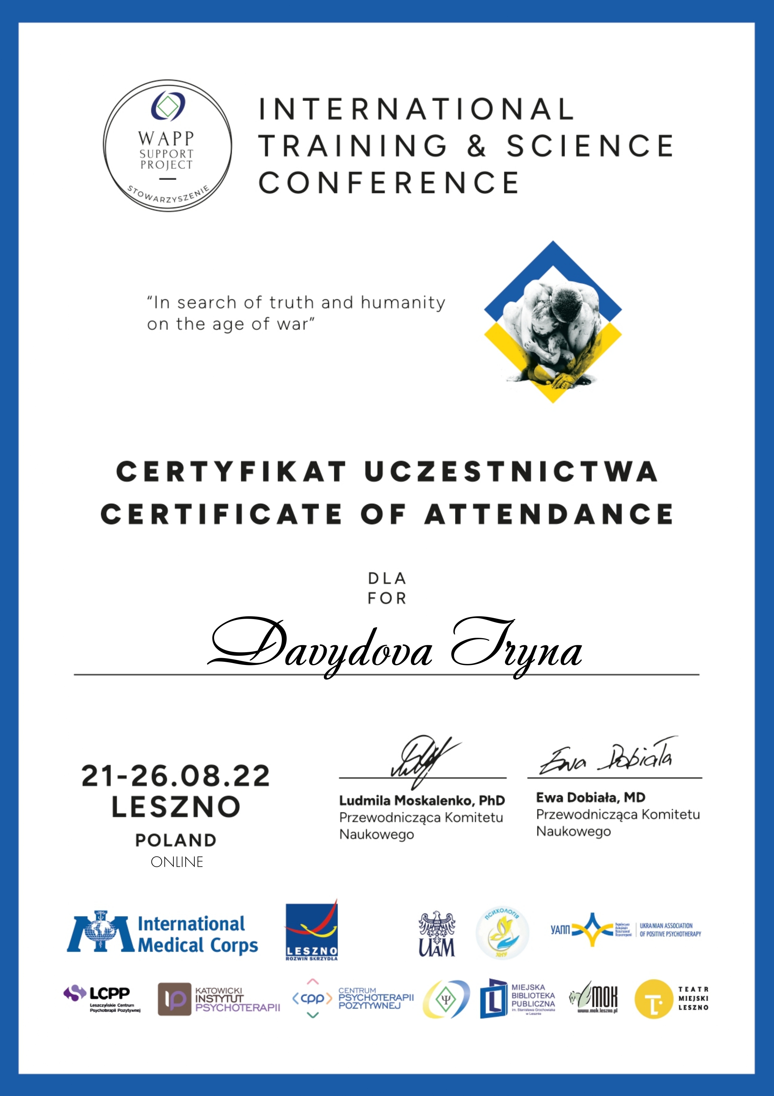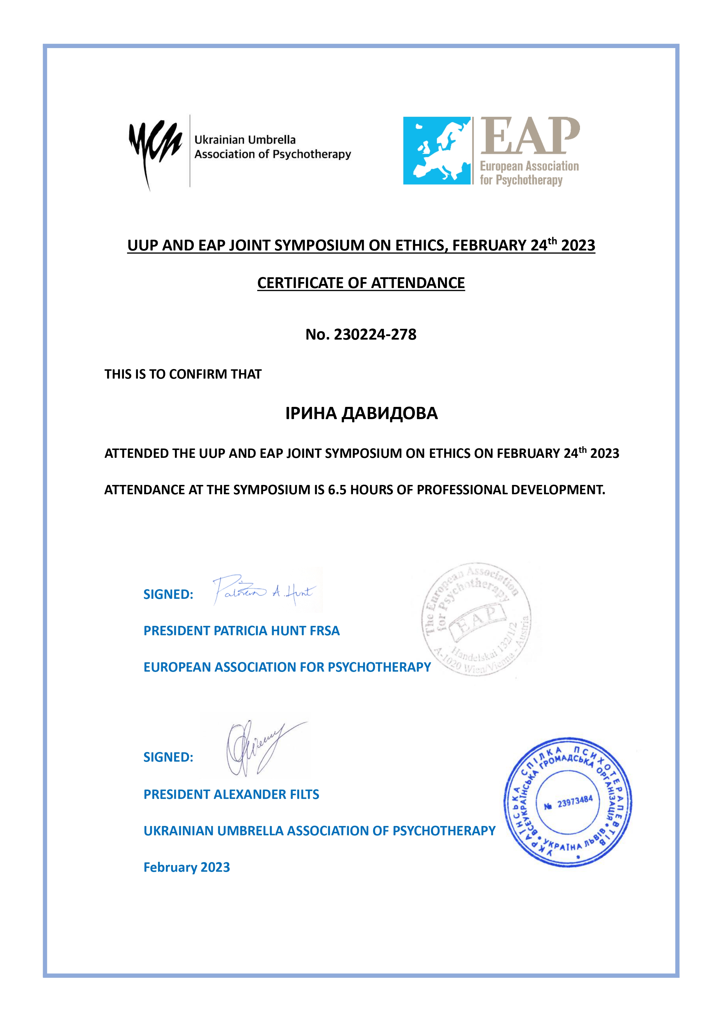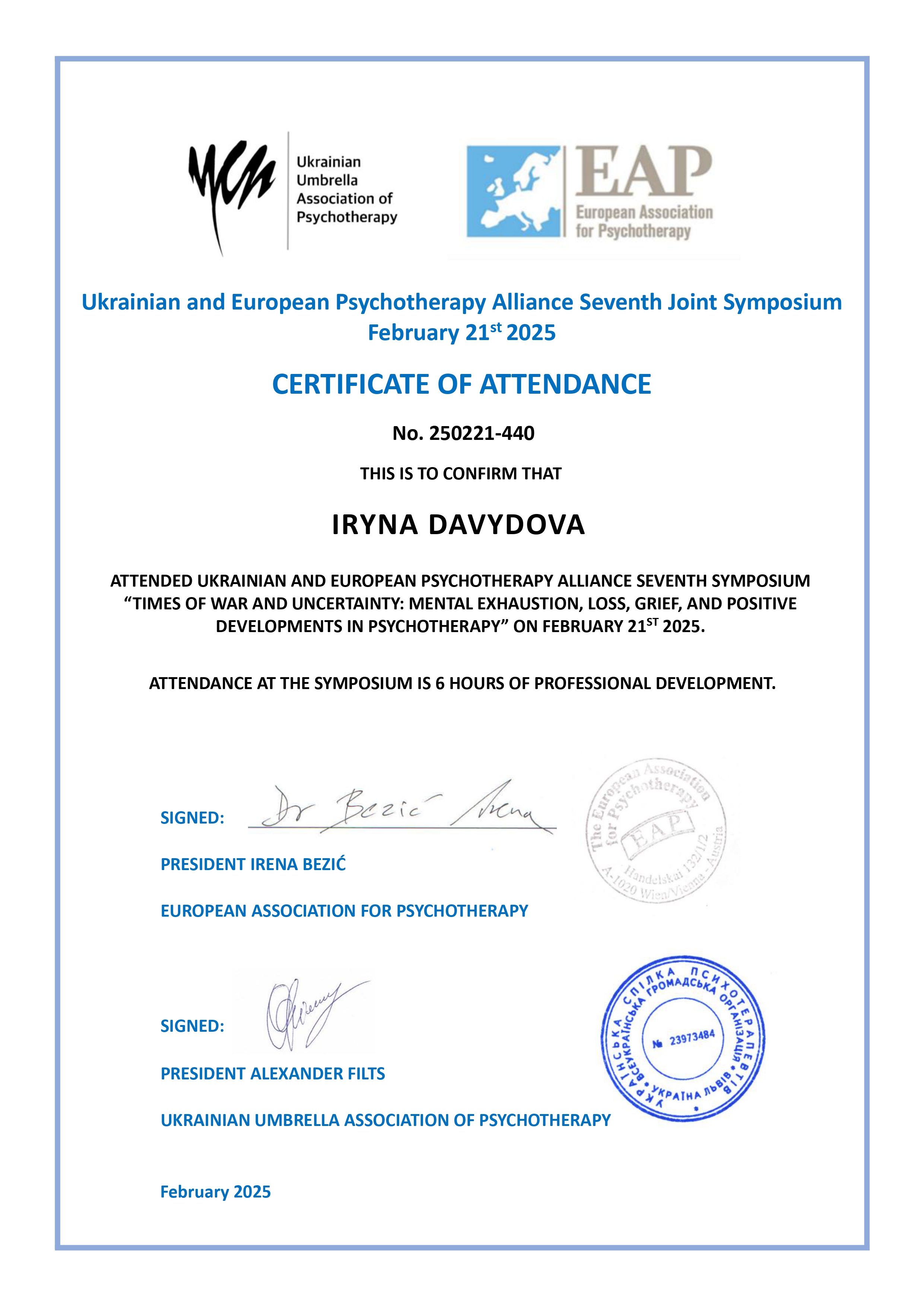 1. Виконання сертифікаційних умов програми Базового курсу з позитивної психотерапії відповідно до стандартів Всесвітньої Асоціації позитивної психотерапії та Українського інституту крос-культурної психотерапії і менеджменту (2021 р.)
