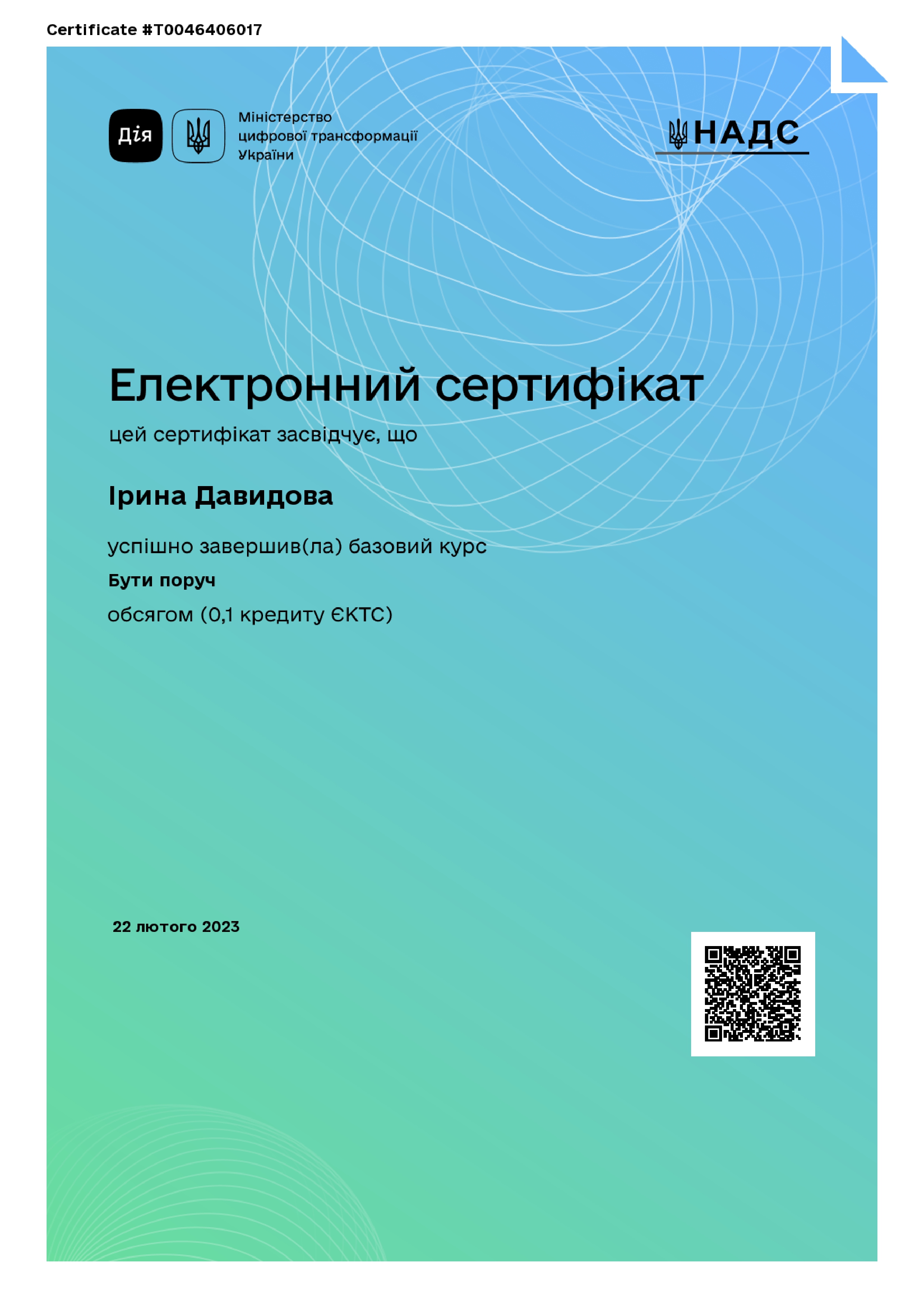 В 2020 р. закінчила Український інститут позитивної крос-культурної психотерапії і менеджменту.