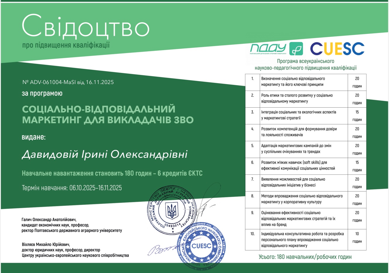 5. Соціально-відповідальний маркетинг для викладачів ЗВО (2025 р.) Всеукраїнське науково-педагогічне підвищення кваліфікації, Центр українсько-європейського наукового співробітництва.