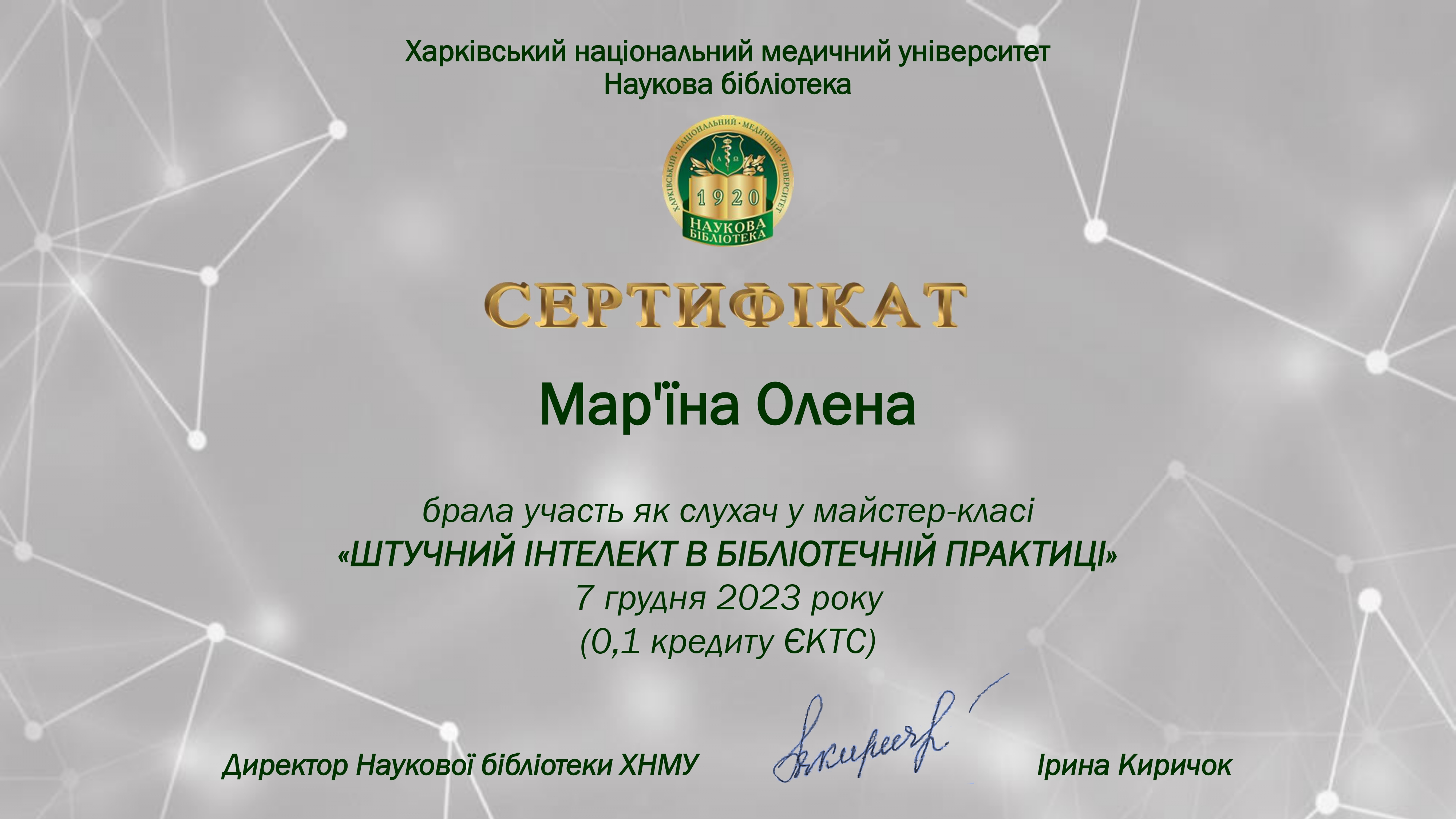 - Курс підвищення кваліфікації для освітян «Штучний інтелект в освіті» від Асоціації інноваційної та цифрової освіти та компанії «UBOS.tech» за сприяння Міністерства освіти і науки України та ДНУ «Інститут модернізації змісту освіти». Сертифікат 73515237 від 6.12.2023 р. 15 годин (0,5 кредита ЄКТС).