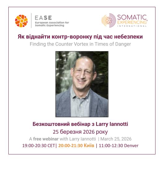 Запрошуємо 25 березня о 20.00 за Київським часом на цікавий безкоштовний практикум "Як віднайти контр-воронку під час небезпеки" із соматичним травма-терапевтом Ларрі Яннотті.