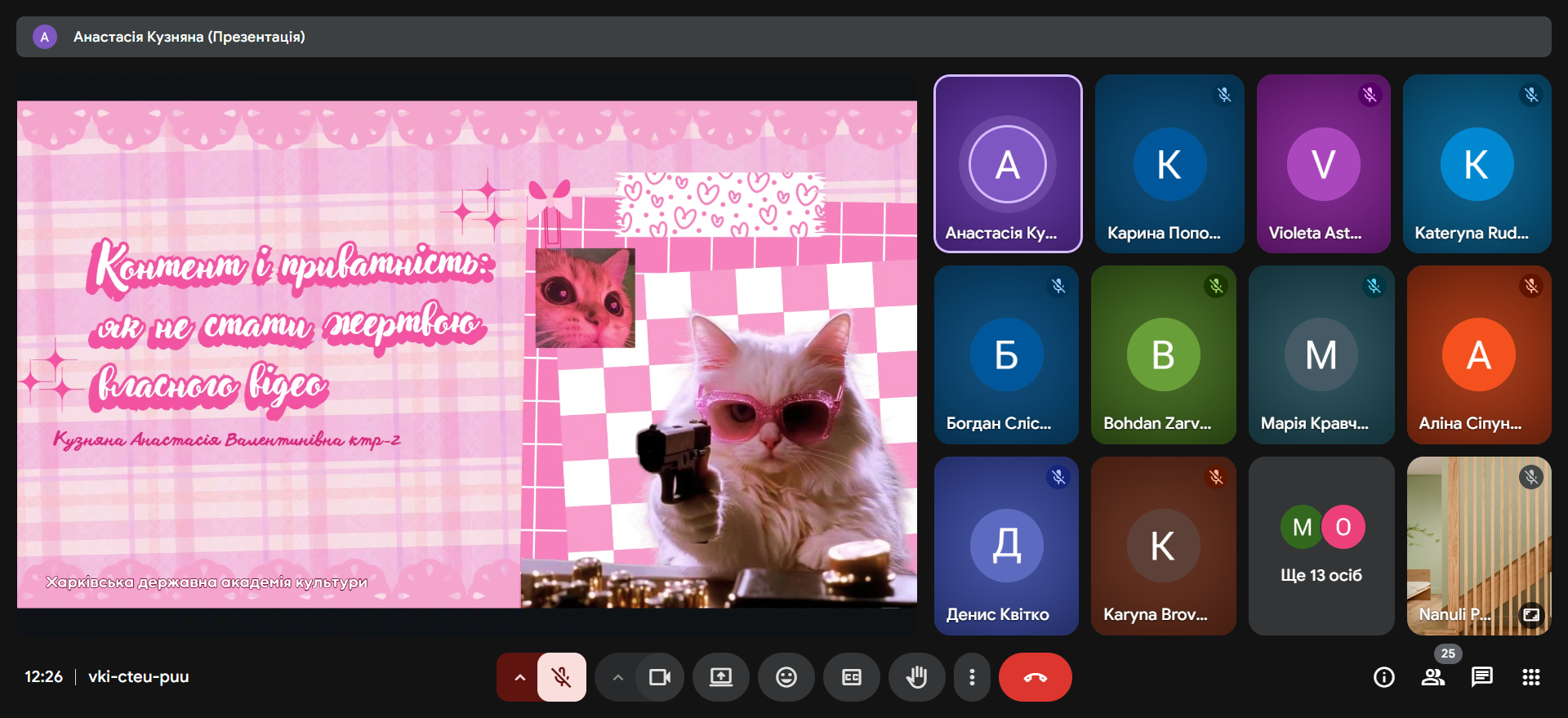 Під час симпозіуму в.о. ректора Наталія Рябуха передала Крістоферу Бейлі (ВООЗ) українську ляльку-мотанку — створену руками харків’ян під час тривог і обстрілів під керівництвом народної майстрині, доцентки ХДАК Юлії Соловйової. Цей символічний дарунок уособлює незламність, духовну силу й життєствердний характер української культури, що навіть у найтяжчі часи народжує красу.