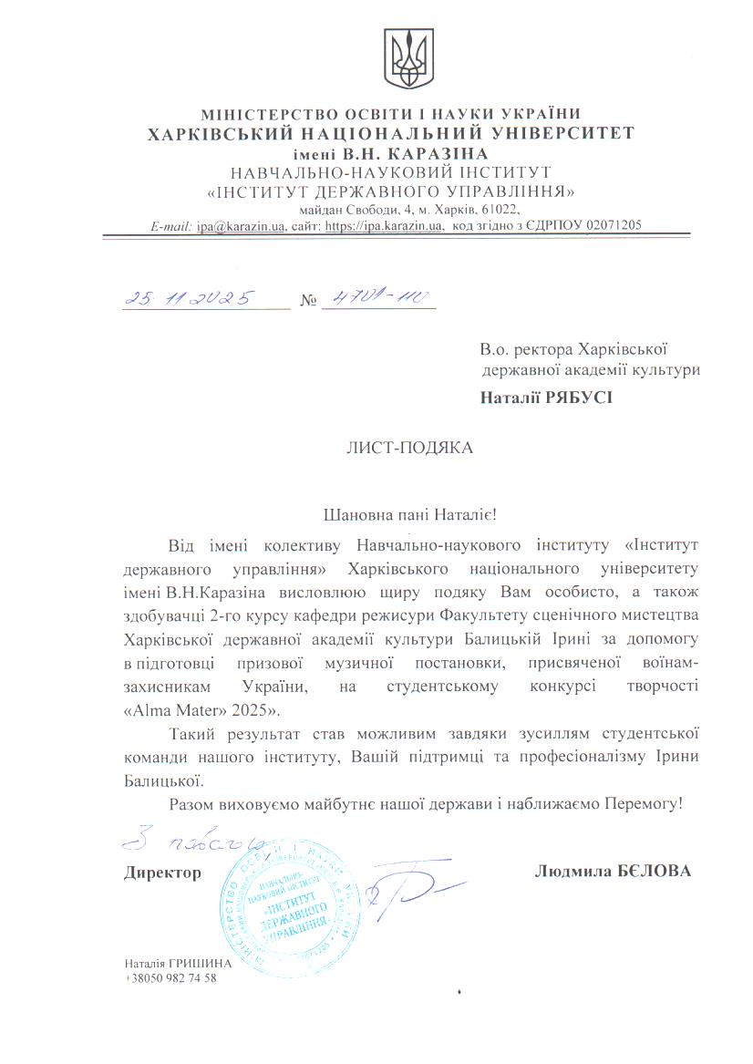 21 листопада 2025 р. на кафедрі режисури Харківської державної академії культури відбувся експериментальний формат роботи зі сценічним матеріалом - бліц-читка та ескізний показ п’єси «Бамбуковий шест» у постановці та драматургії Дар'ї Гаврилюк, студентки факультету сценічного мистецтв Академії.