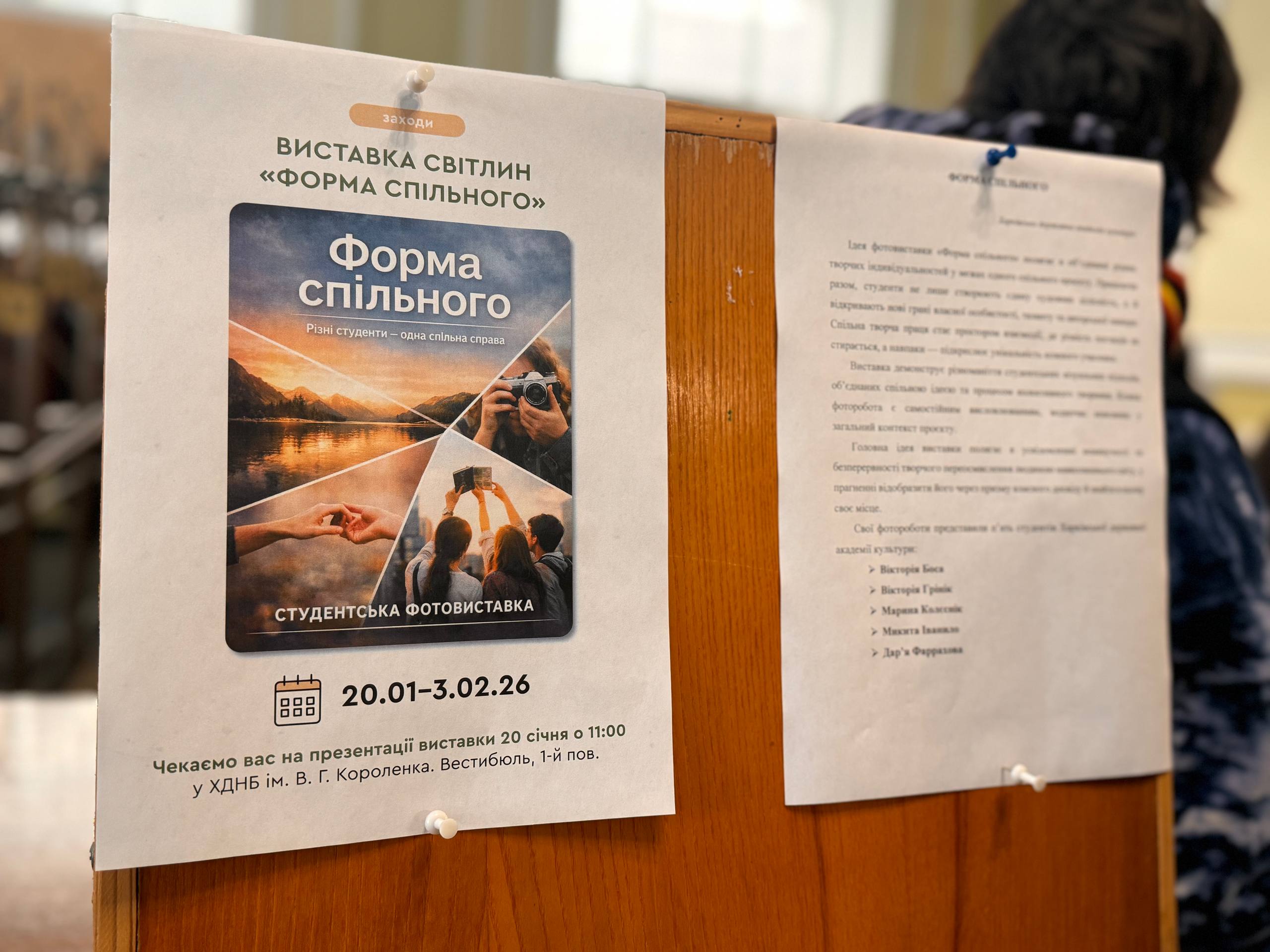 20 січня 2026 р., до Дня Соборності України, у Харківській державній науковій бібліотеці імені В. Г. Короленка відбулося урочисте відкриття фотовиставки «Форма спільного», яка об’єднала творчі роботи студентів факультету аудіовізуального мистецтва Харківської державної академії культури. Експозиція триватиме до 3 лютого.