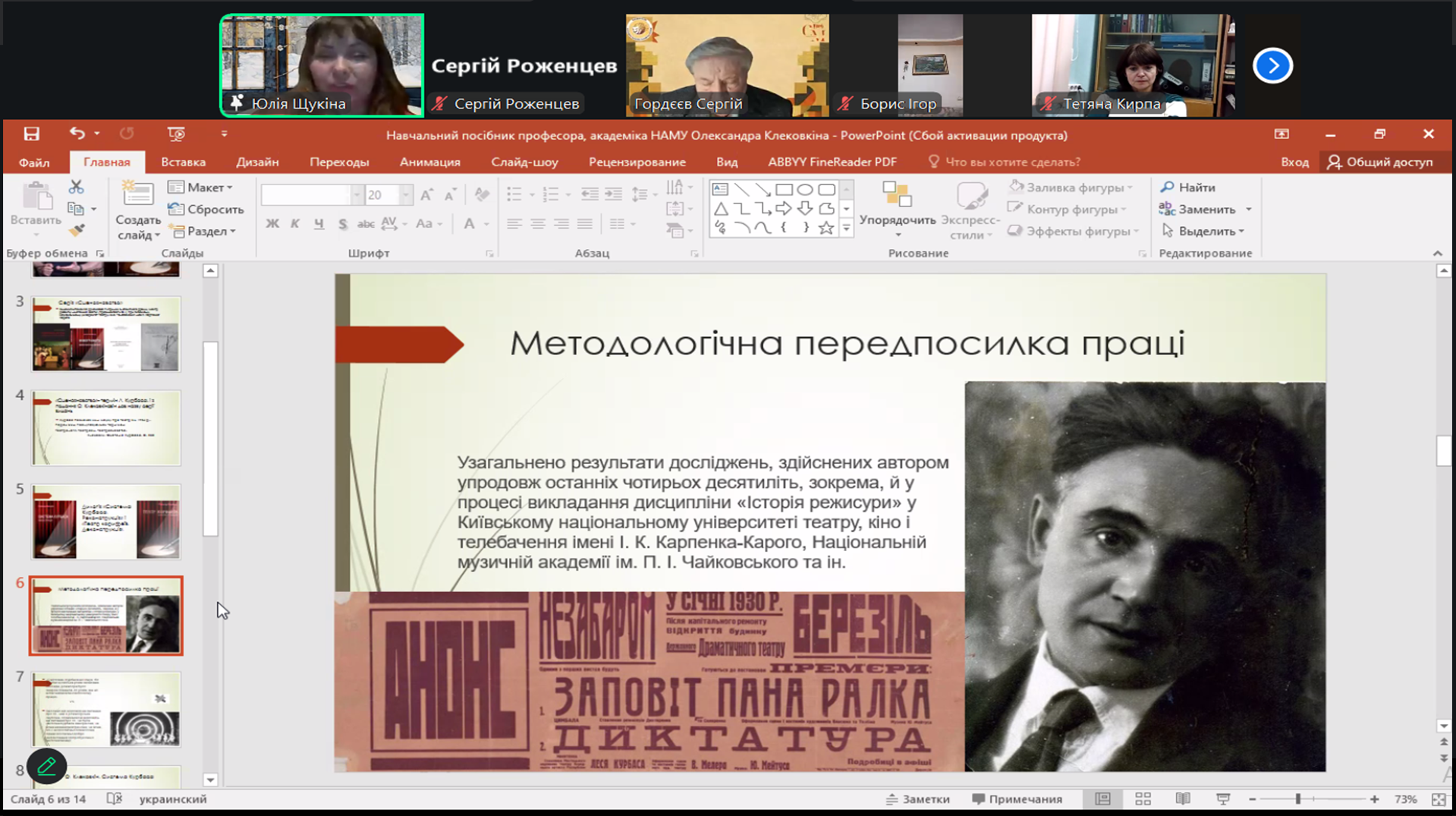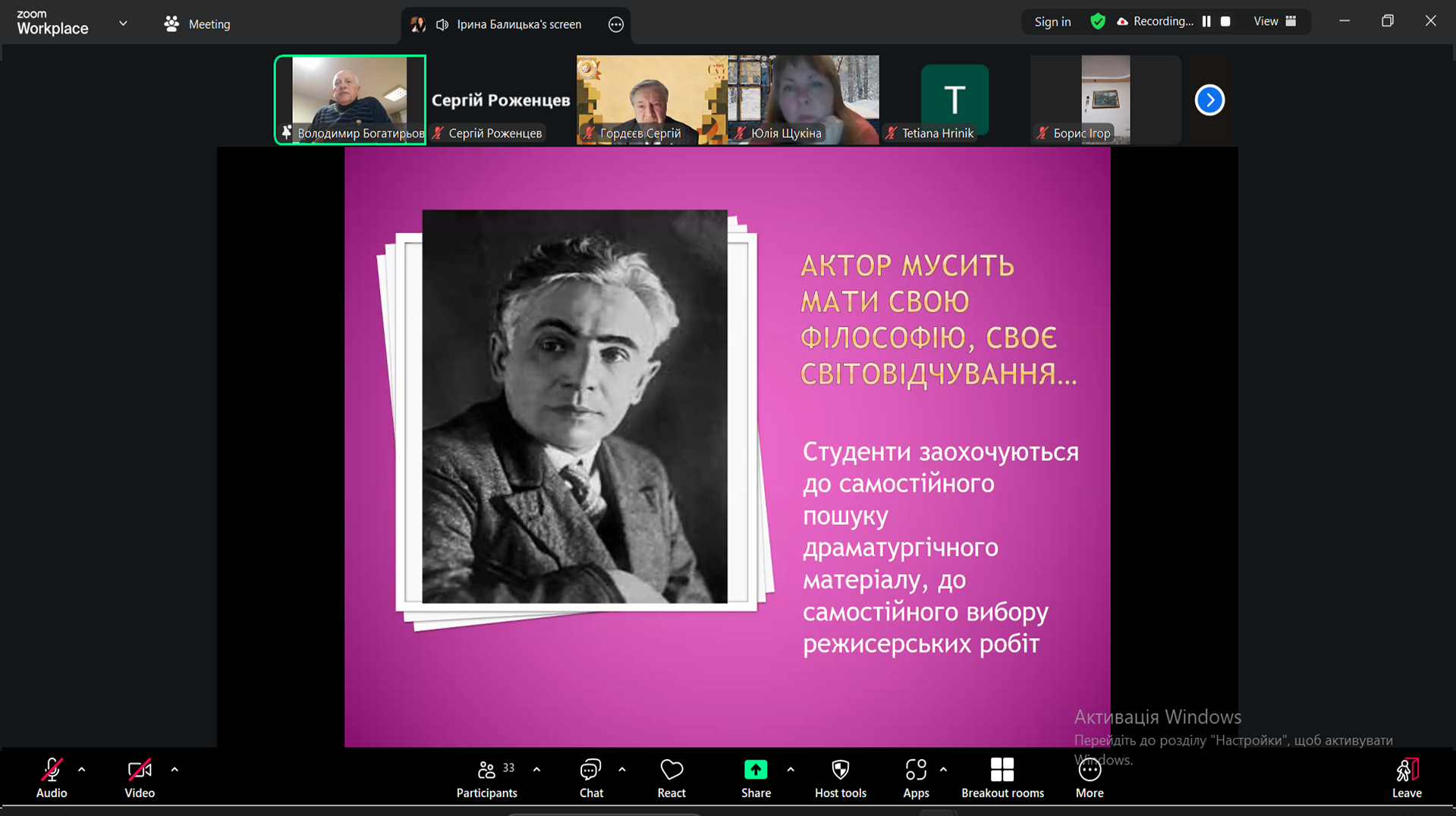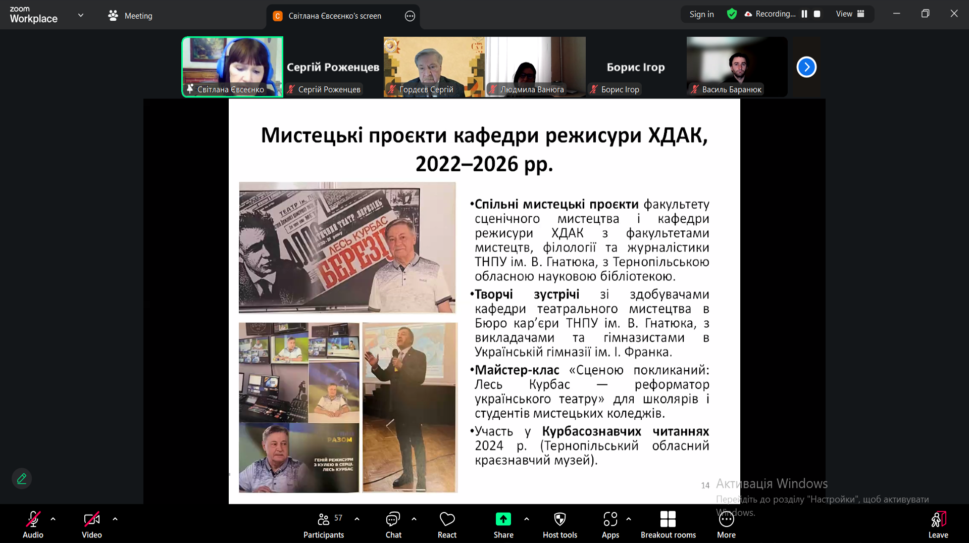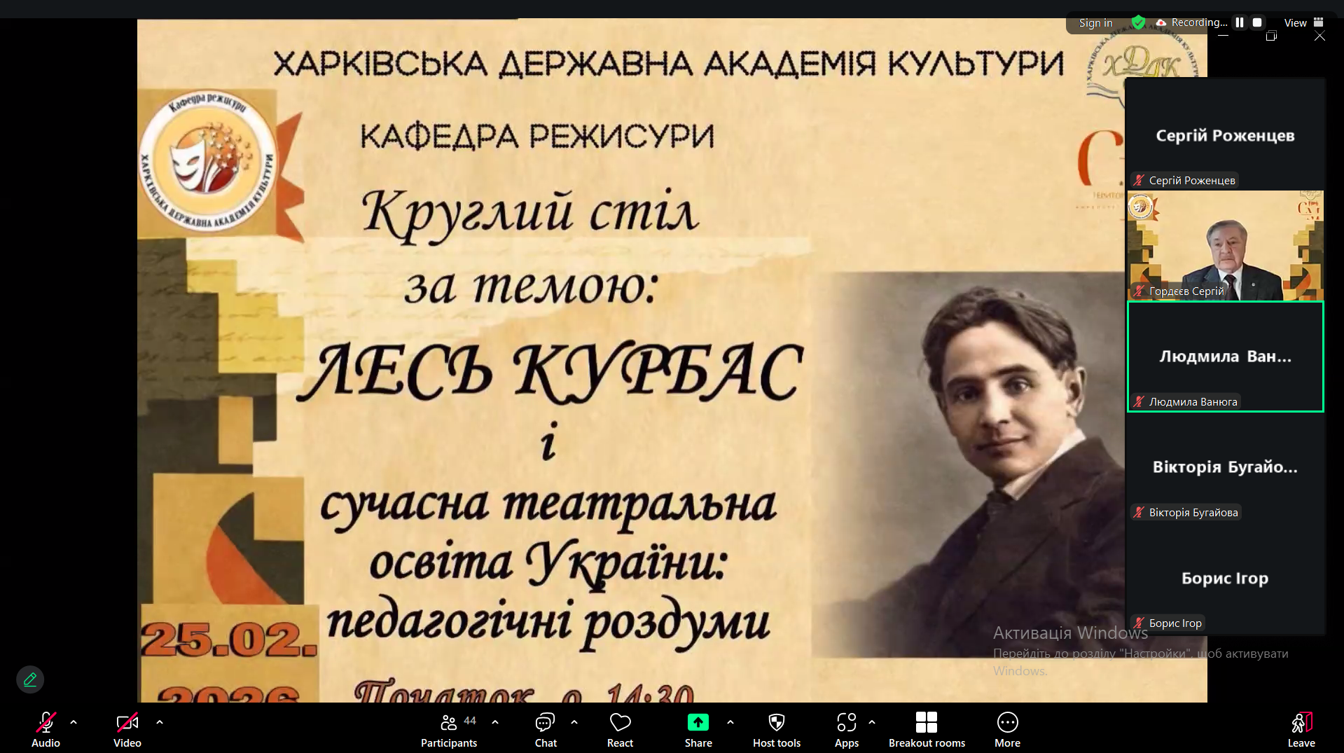 Зустріч тривала понад чотири години в онлайн-форматі та об’єднала викладачів і студентів із різних театральних закладів вищої освіти України – Харківщини, Львівщини, Рівненщини та Тернопільщини. Символічно, що саме з Тернопільщини – краю, звідки походили батьки Леся Курбаса, – свого часу розпочалося формування майбутнього митця як одного з найпотужніших реформаторів українського театру.
