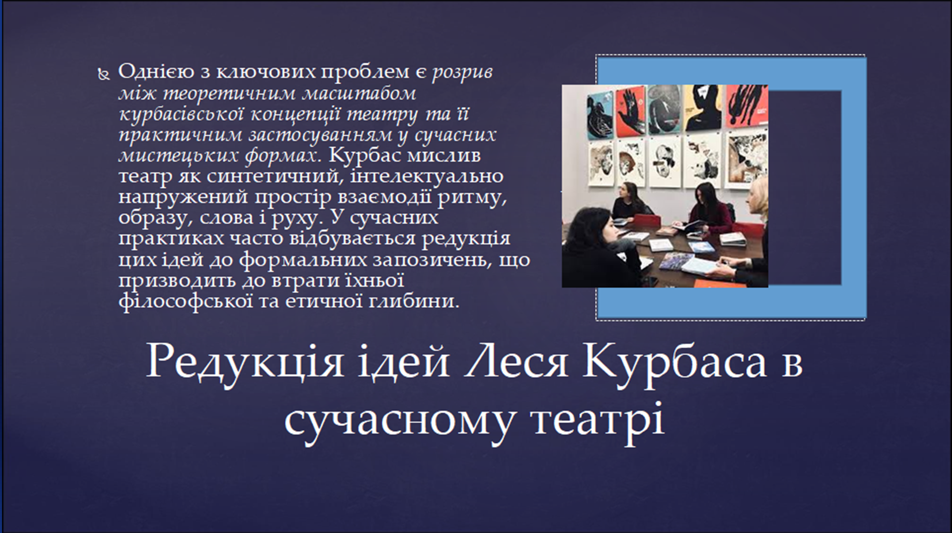 Ключовими питаннями наукової дискусії стали мистецька й педагогічна спадщина Леся Курбаса, проблеми сучасного сценічного мистецтва та розвиток театральної освіти в Україні.