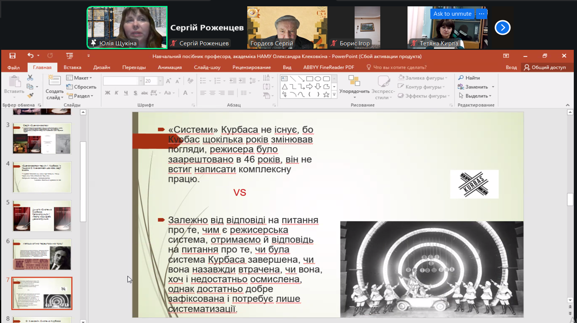 Практичний вимір осмислення спадщини Курбаса в сучасній режисерській освіті було представлено у доповіді «Навчальний посібник професора, академіка НАМУ Олександра Клековкіна “Система Курбаса: Реконструкція” як інструмент практичної роботи режисера» Юлії Щукіної – кандидатки мистецтвознавства, доцентки, завідувачки кафедри театрознавства Харківського національного університету мистецтв імені І. П. Котляревського, лауреатки премії НСТДУ в галузі театрознавства і театральної критики.