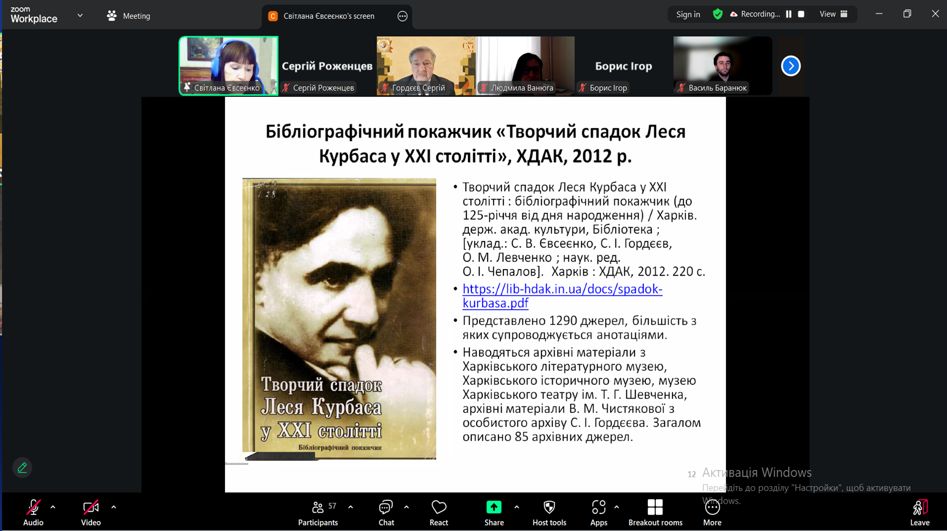 Роботу круглого столу було розпочато з виступу провідного бібліографа бібліотеки ХДАК Світлани Євсеєнко. Її доповідь стала змістовним вступом до наукової дискусії та задала тематичний вектор подальших виступів, окресливши масштаб наукової й творчої роботи, присвяченої осмисленню та популяризації спадщини Леся Курбаса. У своїй доповіді Світлана Василівна окреслила масштабну наукову й творчу роботу кафедри режисури, присвячену осмисленню та популяризації спадщини Леся Курбаса. Зокрема, було згадано про організацію та проведення у Харкові міжнародного фестивалю «Березіль-93», започаткованого у 1993 році під керівництвом професора Сергія Івановича Гордєєва, а також про численні театральні заходи, наукові конференції та урочистості, що протягом багатьох років і до сьогодні проводяться на честь видатного майстра українського театру. Доповідь супроводжувалася змістовною та яскравою відеопрезентацією. Після цього учасники круглого столу мали можливість переглянути архівні відеоматеріали, присвячені фестивалю «Березіль-93», урочистому відкриттю пантеону родини Курбасів та встановленню пам’ятного знака на його честь.