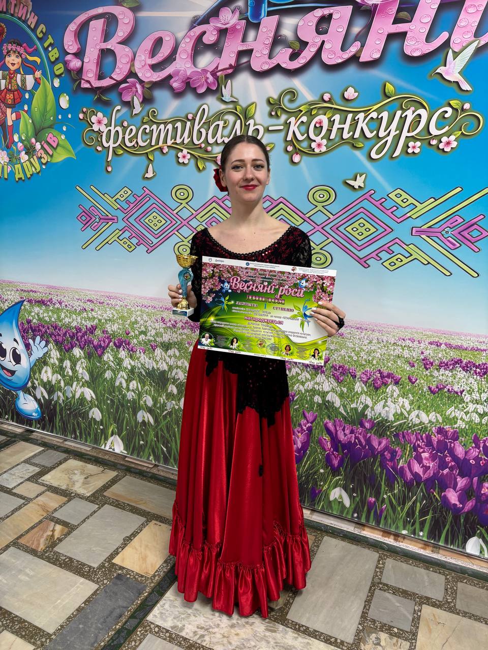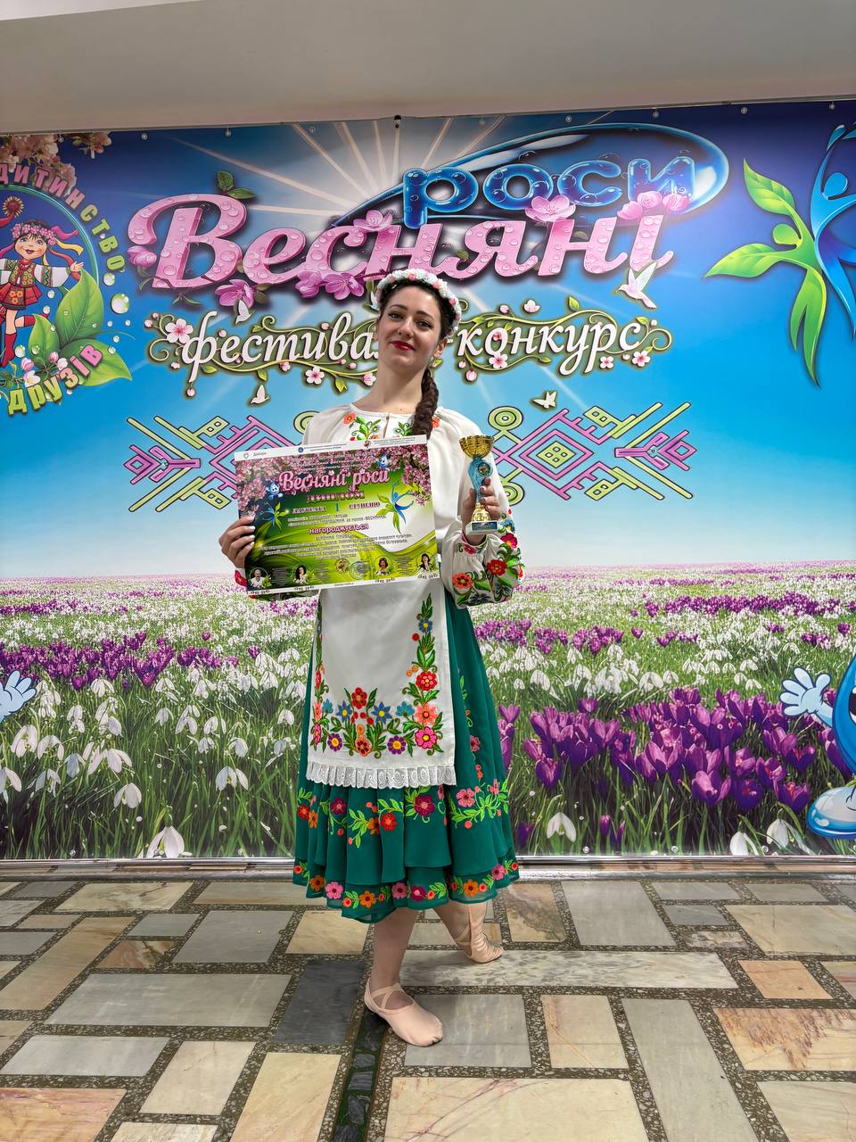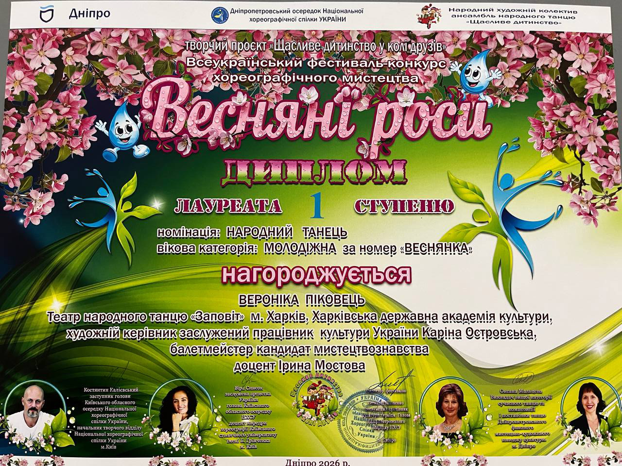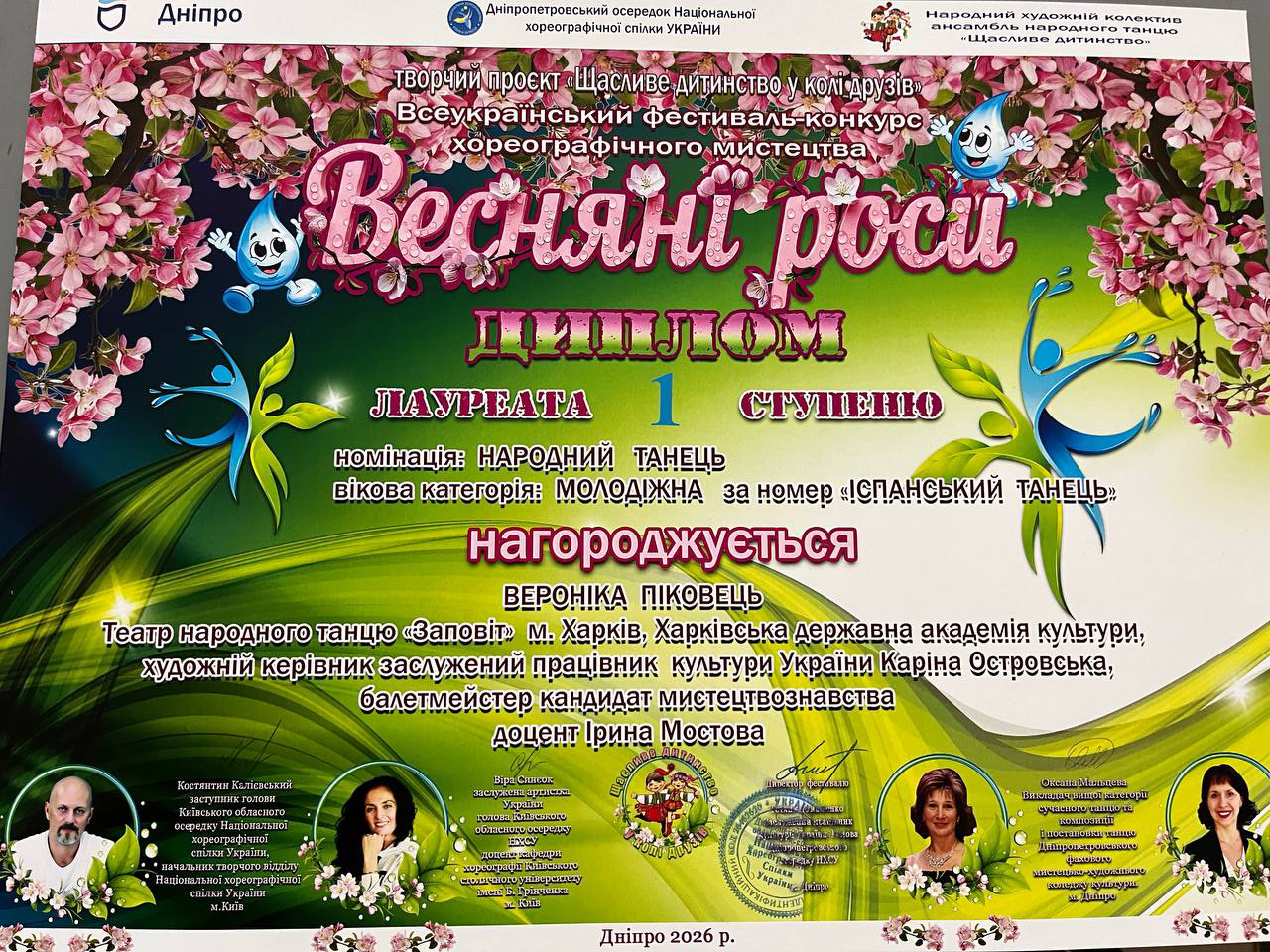 28.03.2026 року у місті Дніпро відбувся Всеукраїнський фестиваль-конкурс хореографічного мистецтва "Весняні роси", на якому здобувачка вищої освіти 3 курсу ОП Народна хореографія та солістка театру народного танцю "Заповіт" кафедри НХТТ Вероніка ПІКОВЕЦЬ отримала дві вищих нагороди: диплом лауреату І ступеню за виконання танцю "Іспанський танець" та диплом диплом лауреату І ступеню за виконання танцю "Веснянка".