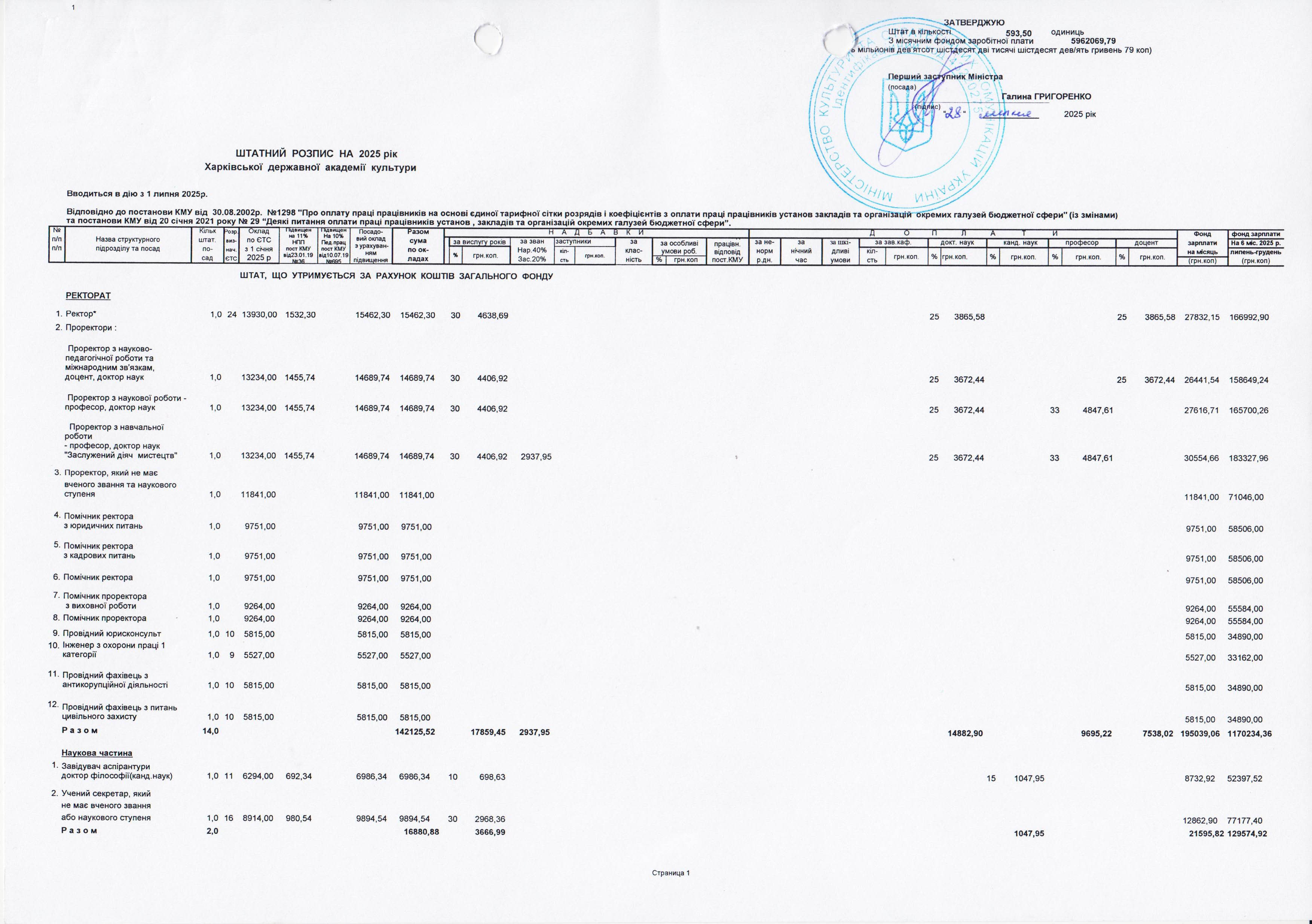 Штатний розпис на 2025 рік Харківської державної академії культури