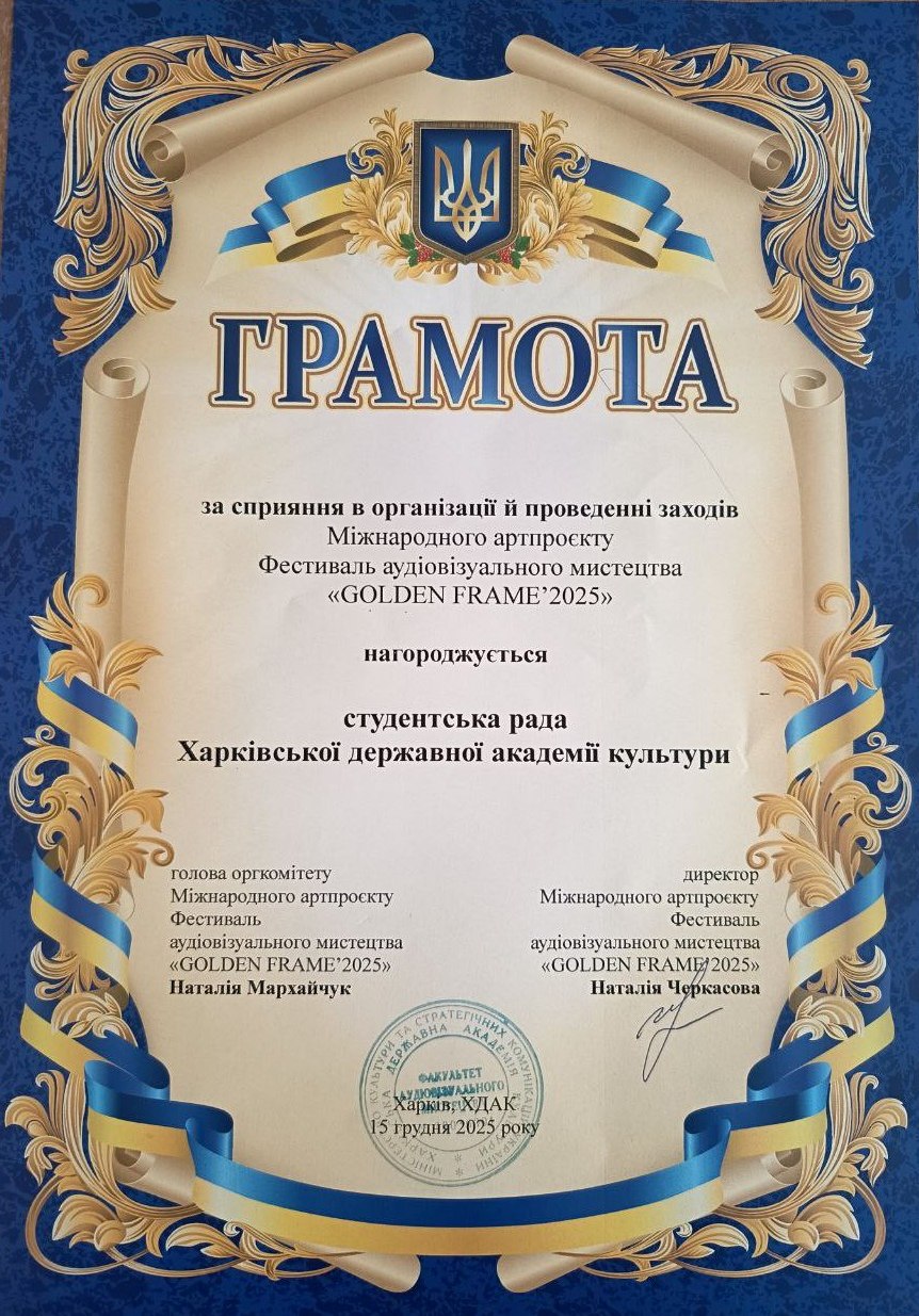 Під час урочистостей було відзначено роботу організаційного комітету та викладачів Академії. Грамоту за активну допомогу в організації Міжнародного арт-проєкту «Фестиваль аудіовізуального мистецтва GOLDEN FRAME’2025» урочисто вручено представниці Студентської ради Харківської державної академії культури – її Голові Маргариті Бутко.